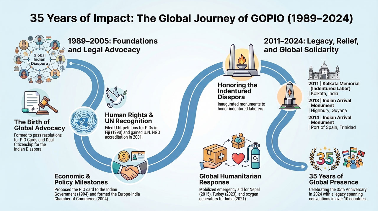 GOPIO is a non-partisan, secular global organization engaged in promoting the well being of People of Indian Origin, enhancing cooperation and communication between Indians living in different countries. With this perspective some specific objectives of GOPIO are: